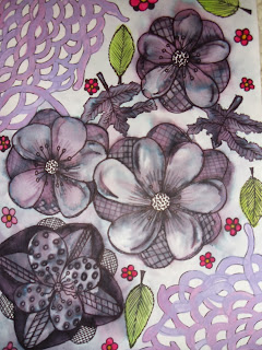 floral pattern using batik and for the background I used various colours of brusho powder and added water to make the colours bleed into each other creating a multicoloured background. |